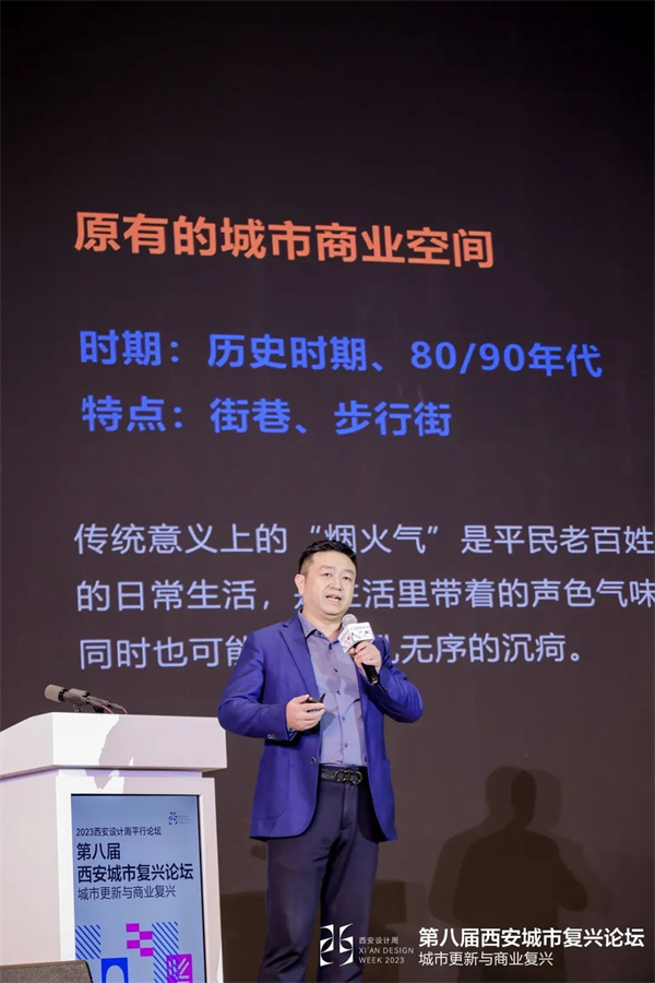 西安城市復(fù)興論壇發(fā)起人、老鋼廠設(shè)計創(chuàng)意產(chǎn)業(yè)園創(chuàng)始人、總經(jīng)理、老菜場市井文化創(chuàng)意街區(qū)發(fā)起人全建彪在論壇作《城市更新重塑西安古城新煙火型商業(yè)》的主題演講。從城市更新資深實踐者和探索者的角度,詳細(xì)分析了城市商業(yè)空間現(xiàn)狀,以西安老城街區(qū)微更新改造作為范例,解析城市更新項目實踐中的文化傳承和創(chuàng)意賦能,展現(xiàn)城市更新如何將文化藝術(shù)和商業(yè)有機(jī)結(jié)合,分享新型社區(qū)的新商業(yè)模式,探索出城市更新的實踐路徑辦法與意義。