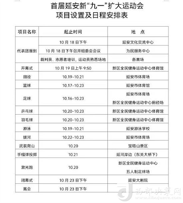 據(jù)介紹,此次運動會開幕式將于19日9:50 在延安新區(qū)全民健身運動中心體育館舉行,參賽隊包括縣(市、區(qū))、市直各行業(yè)、各單位、中省駐延單位、廠礦企業(yè)及大專院校。