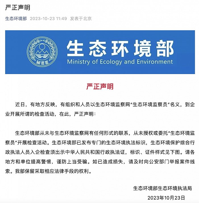 據(jù)生態(tài)環(huán)境部公眾號10月23日消息,近日,有地方反映,有組織和人員以生態(tài)環(huán)境監(jiān)察網(wǎng)“生態(tài)環(huán)境監(jiān)察員”名義,到企業(yè)開展所謂的檢查活動,在此,生態(tài)環(huán)境部嚴正聲明: