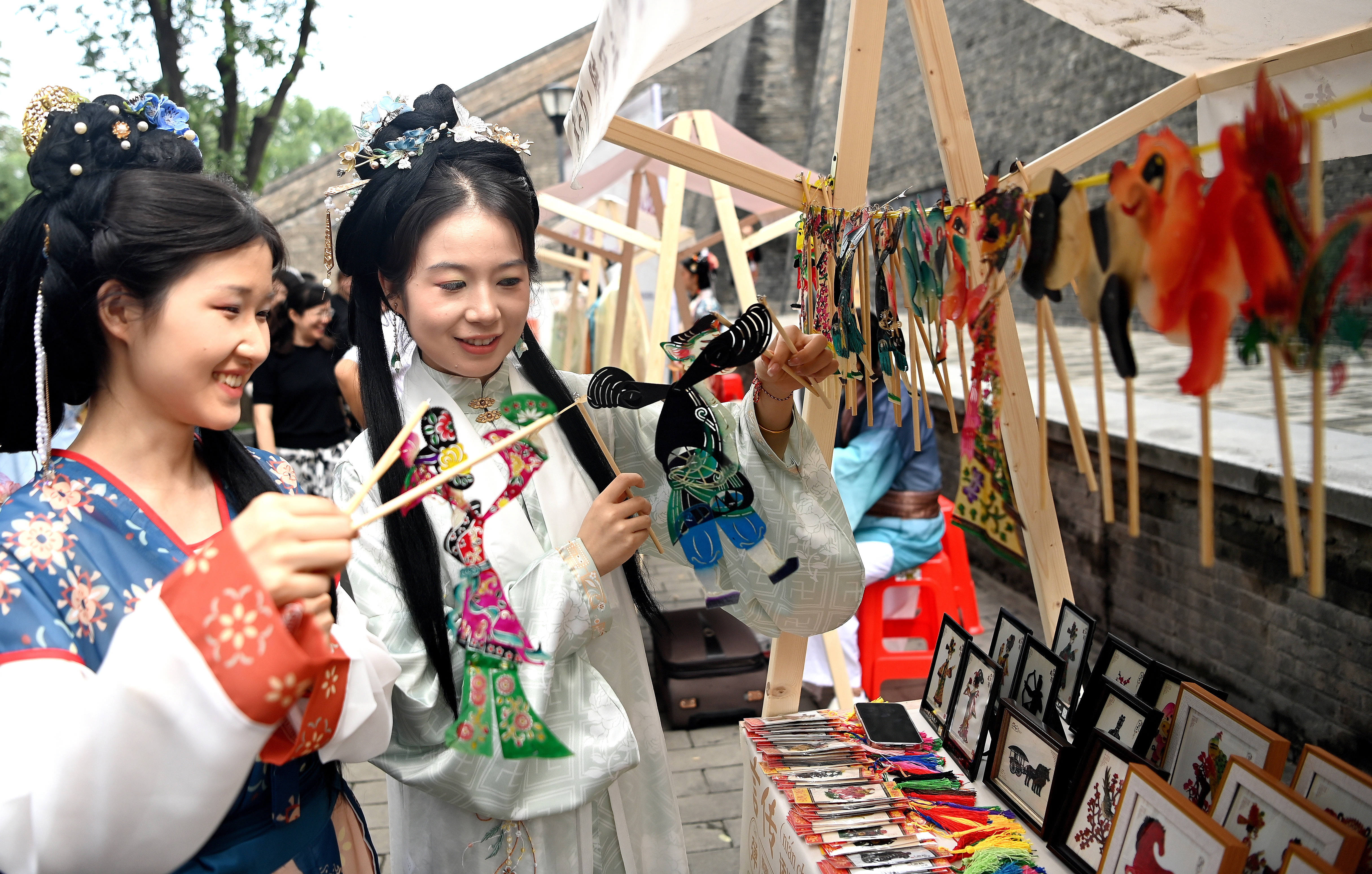 9月12日,西安市新城區(qū)“遇見城墻·非遺韻”非遺集市上,游客在了解陜西皮影。新華社記者 劉瀟 攝