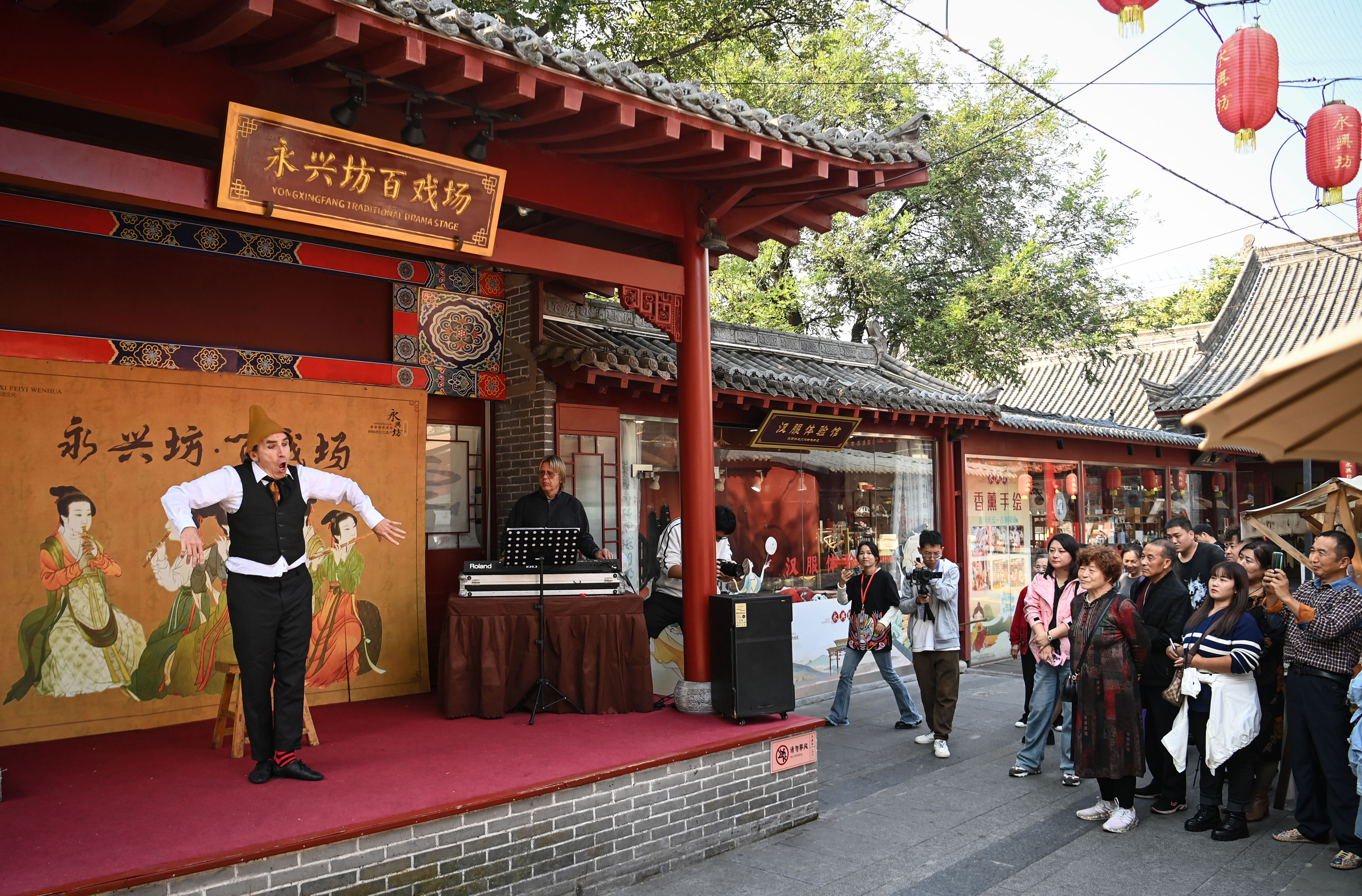 10月16日,來自斯洛伐克法帝西摩劇院的默劇表演藝術(shù)家弗拉基米爾·庫利塞克(左)在西安永興坊進行惠民巡演。新華社記者 鄒競一 攝