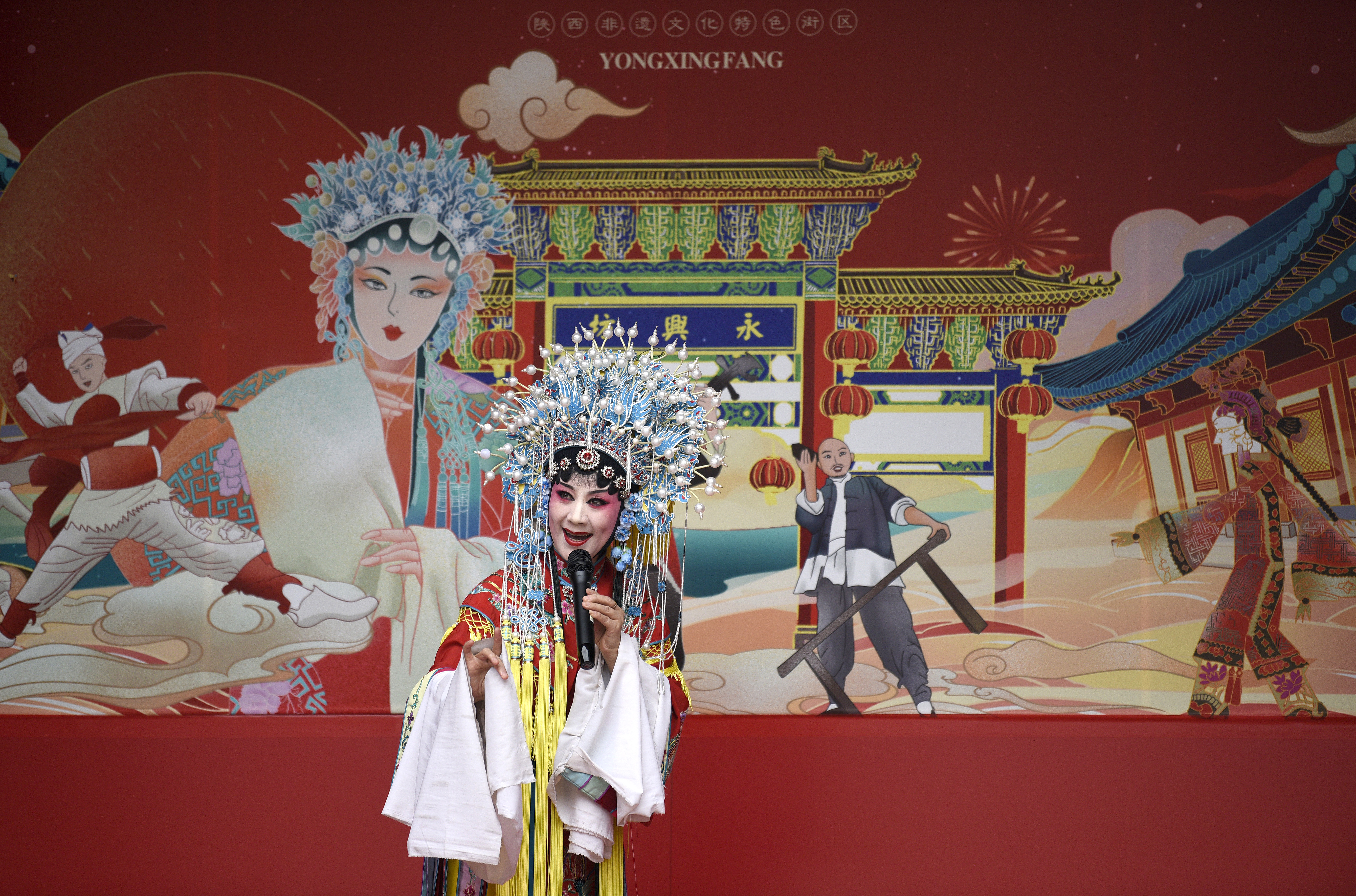 9月12日,西安市新城區(qū)“遇見城墻·非遺韻”非遺集市上,表演者在進行秦腔演出。新華社記者 劉瀟 攝