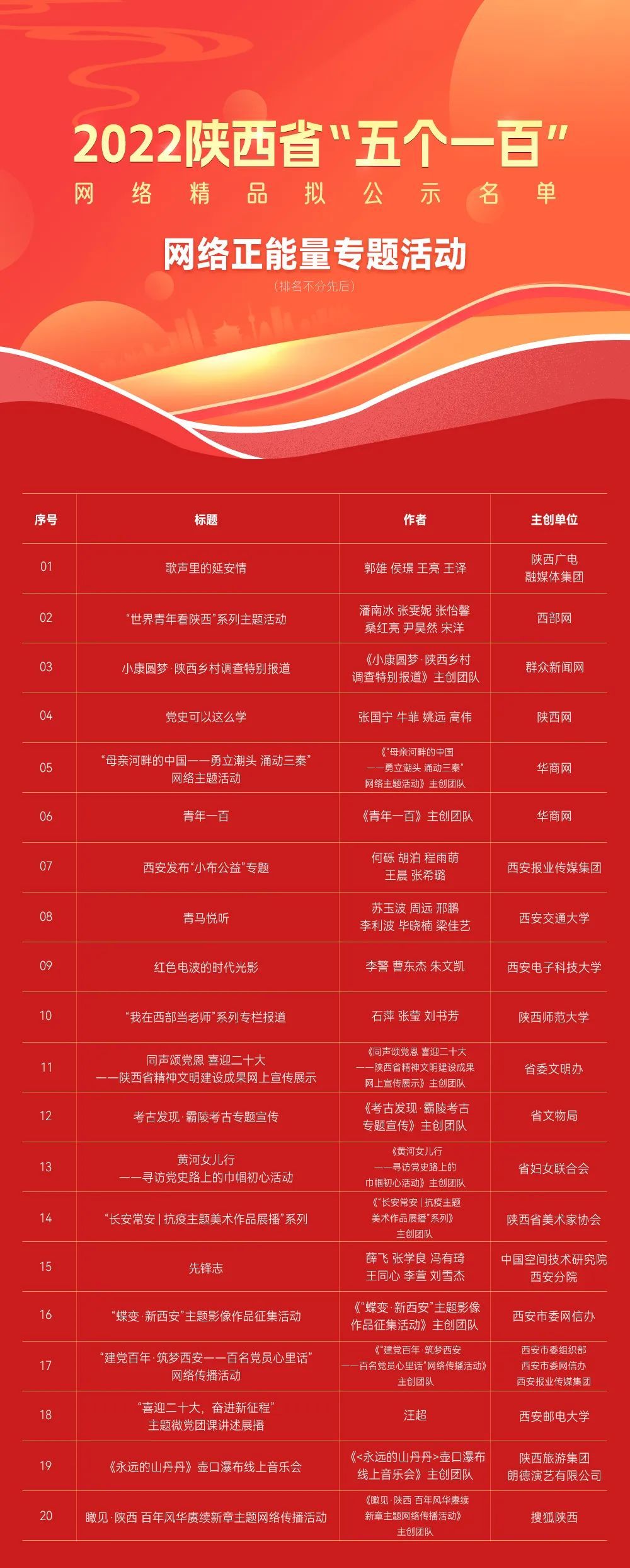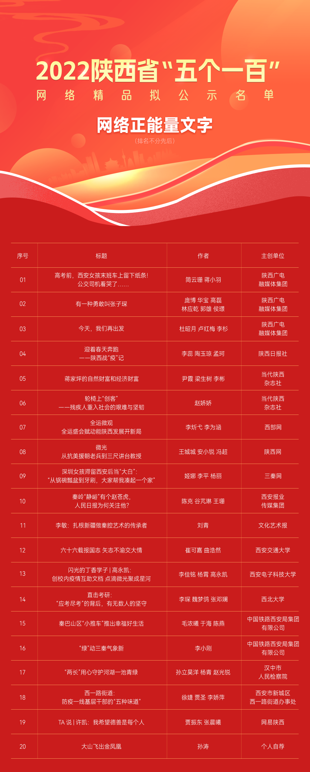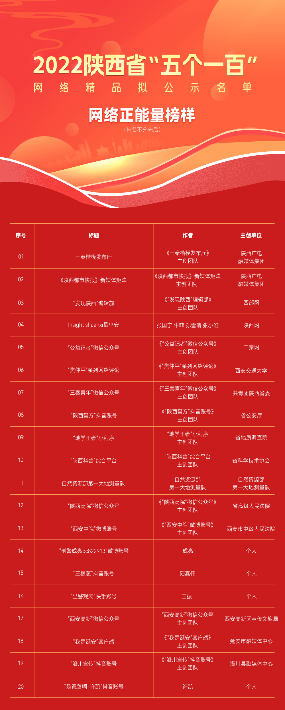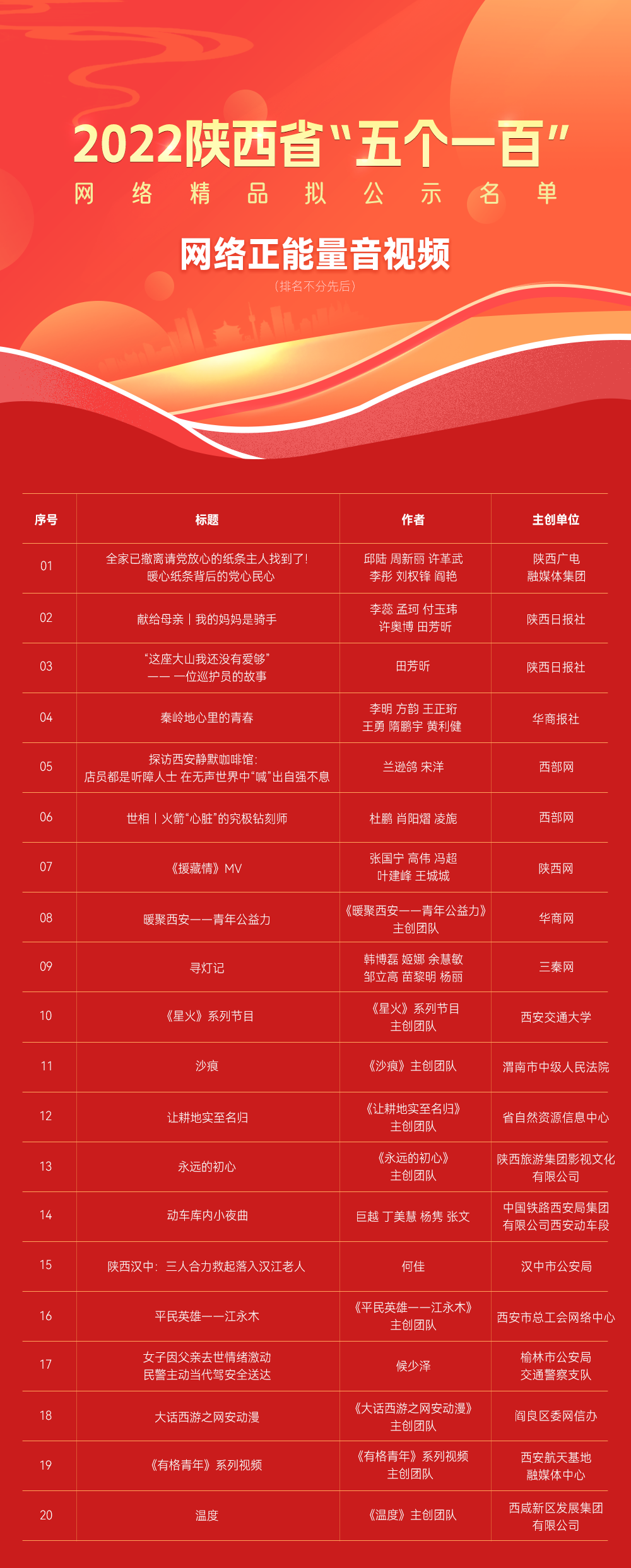 近日,記者從陜西省委網(wǎng)信辦獲悉:2022陜西省“五個(gè)一百”網(wǎng)絡(luò)精品終選結(jié)果出爐,共100件網(wǎng)絡(luò)正能量作品脫穎而出。具體名單如下: