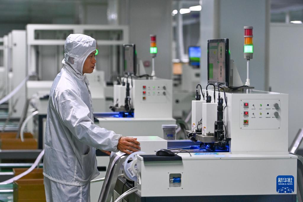 工作人員在新疆喀什綜合保稅區(qū)內的一家電子科技公司生產(chǎn)車間作業(yè)(11月4日攝)。