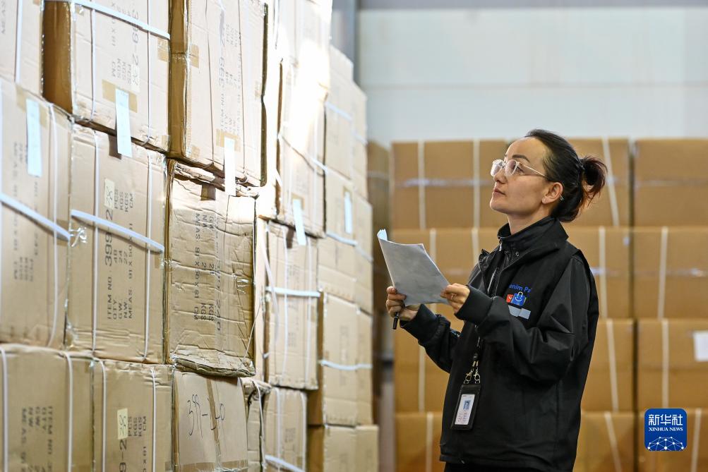 庫管員在新疆喀什綜合保稅區(qū)內的中順電子跨境電商貨物分揀中心核對出口的貨物(11月4日攝)。