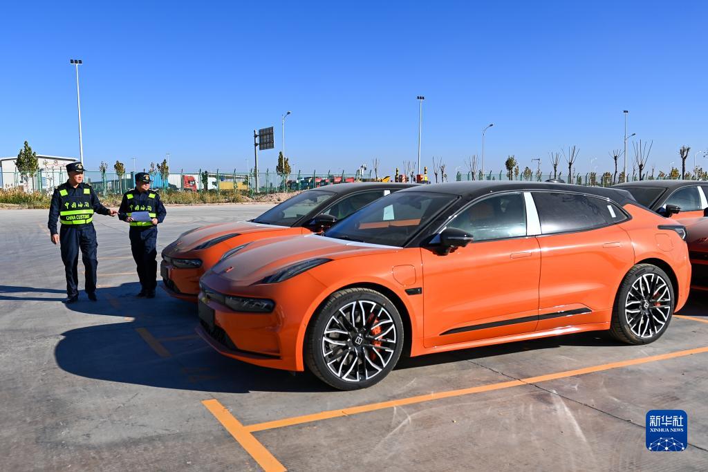 海關關員在新疆喀什綜合保稅區(qū)內的海關施封集中查驗作業(yè)區(qū)查驗出口商品車(11月4日攝)。
