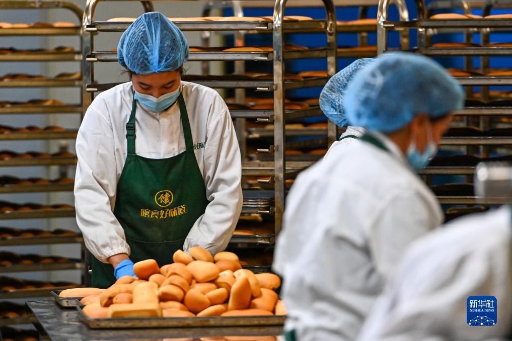 工作人員在新疆喀什綜合保稅區(qū)內的新疆疆來美農(nóng)業(yè)科技有限公司分揀剛做好的糕點(11月4日攝)。