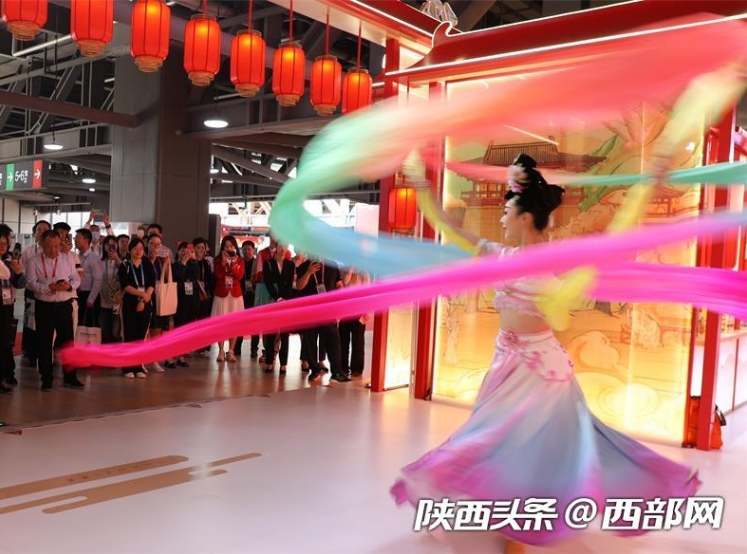 陜西國家級步行街展區(qū)仿唐歌舞吸引觀眾駐足。