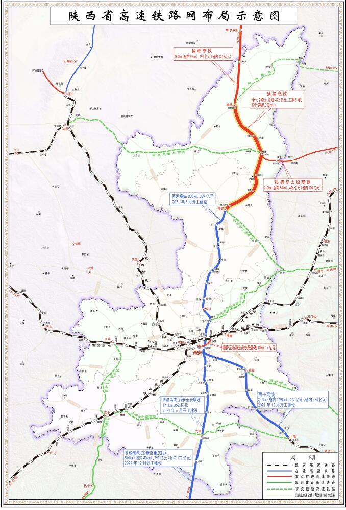 國(guó)家中長(zhǎng)期鐵路網(wǎng)“八縱八橫”高鐵通道中陸橋通道、包(銀)海通道、京昆通道、青銀通道以及西武區(qū)域連接線貫穿陜西省,形成以西安為中心的“米”字型高鐵網(wǎng),奠定了陜西省“承東啟西,連貫?zāi)媳?rdquo;的路網(wǎng)地位。在今天(11月5日)上午舉行的延安至榆林高速鐵路開工動(dòng)員會(huì)現(xiàn)場(chǎng),展示了陜西在建的4條高鐵項(xiàng)目進(jìn)展情況。