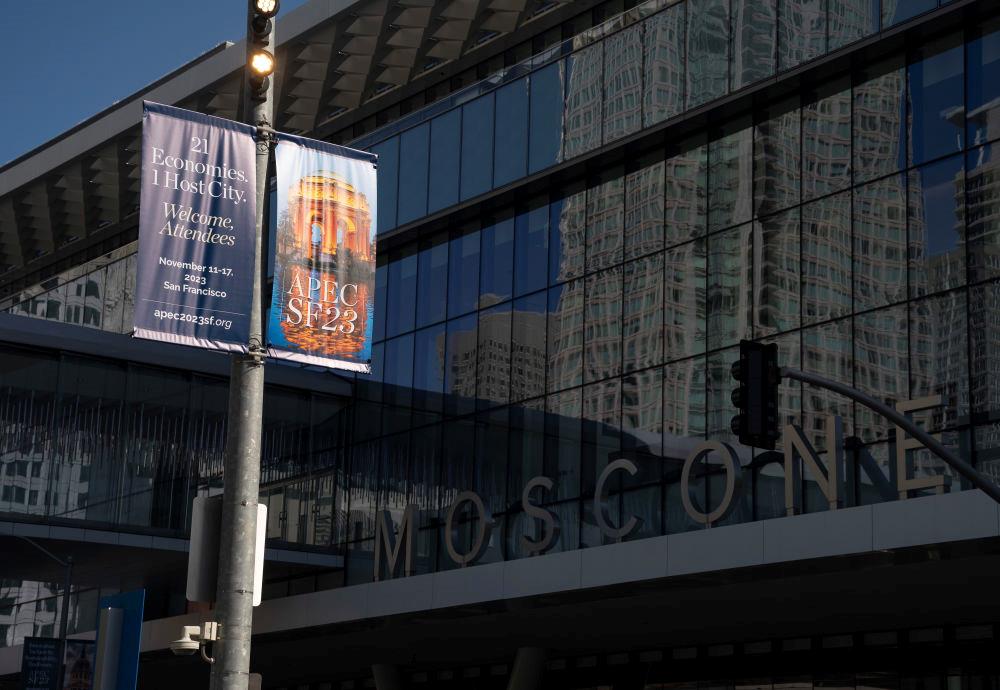 △近日,美國舊金山亞太經(jīng)合組織會議場地外的宣傳海報(bào)。