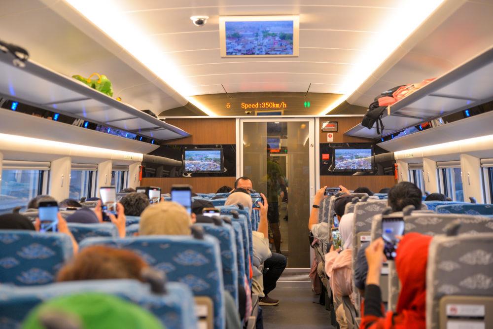△2023年11月5日,在行駛中的雅萬高鐵高速動車組列車車廂內(nèi),乘客紛紛用手機(jī)拍攝顯示列車時(shí)速達(dá)到350公里的電子屏。