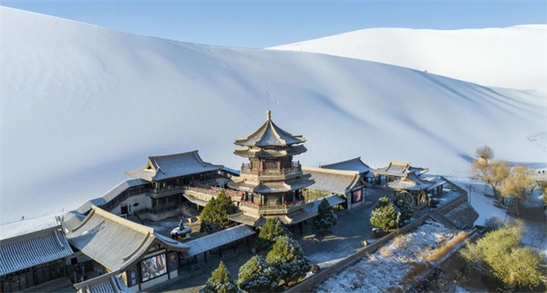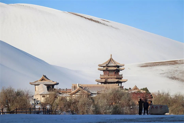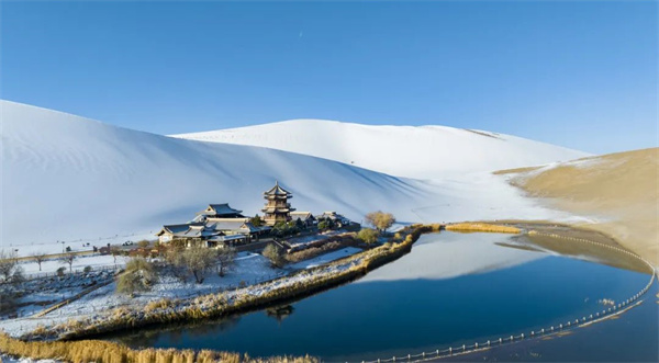有冬要來,有雪入懷,于淺冬邂逅一場初雪的浪漫,2023年11月14日,甘肅敦煌鳴沙山月牙泉迎來今冬首場降雪,白雪鋪遍沙山峰巒,雪落成詩,滿目雪白,雪后的鳴沙山月牙泉似清逸淡雅的水墨畫,碧藍的泉水與落雪交相輝映,組成冬日盛景。