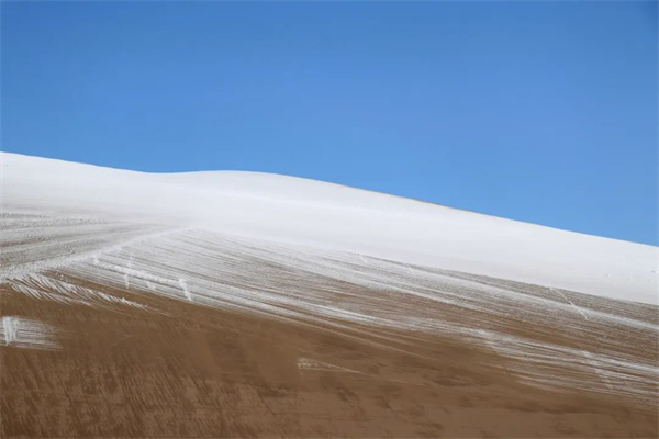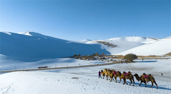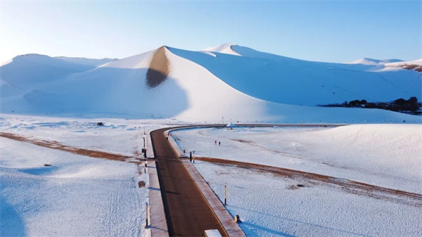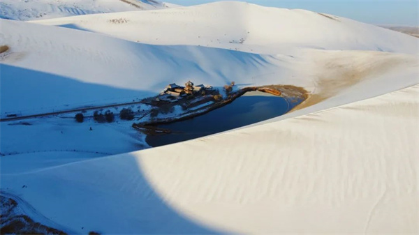 初雪降臨,鳴沙山月牙泉便又浪漫了起來,初雪似筆,將月牙泉清澈的泉水勾勒出來,猶如一彎銀月鑲嵌在沙丘之間,泉水映著沙山雪,微微泛起波紋,像是訴說鳴沙山月牙泉永恒的愛情故事,初冬的月牙泉是碧藍色的,在落雪的沙漠中俯瞰極為壯觀。