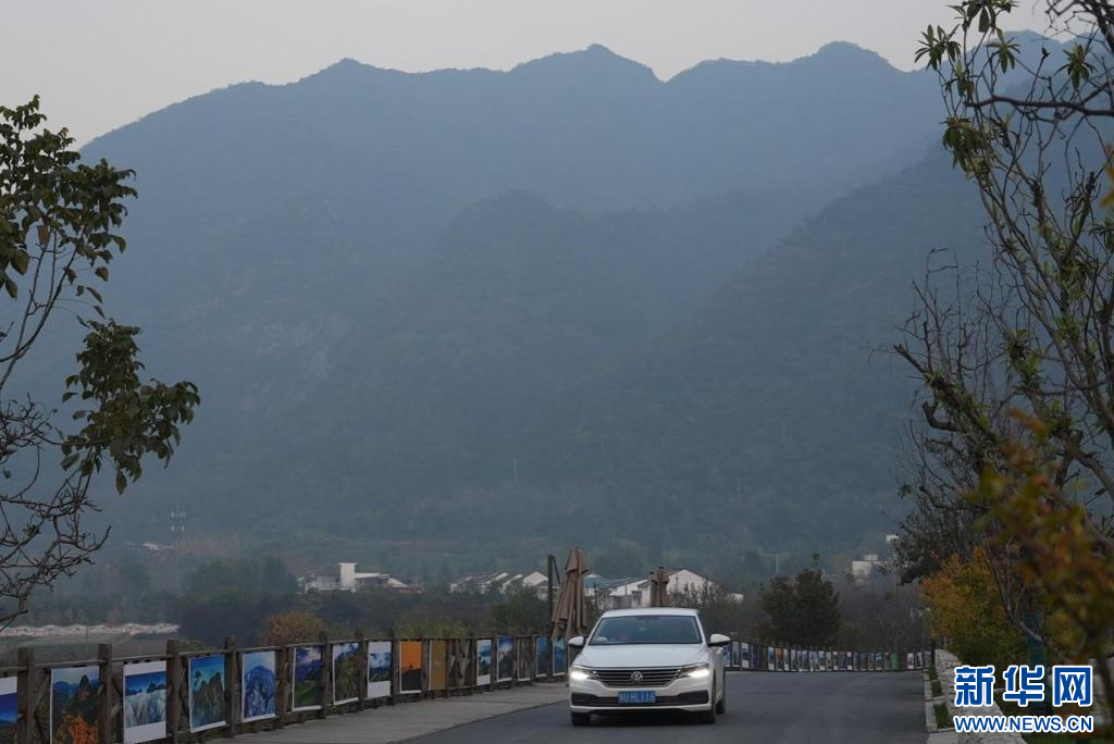 11月13日,在西安市鄠邑區(qū)蔡家坡村,一輛轎車(chē)駛過(guò)柵欄上有攝影展的鄉(xiāng)村公路。新華網(wǎng) 楊喜龍 攝