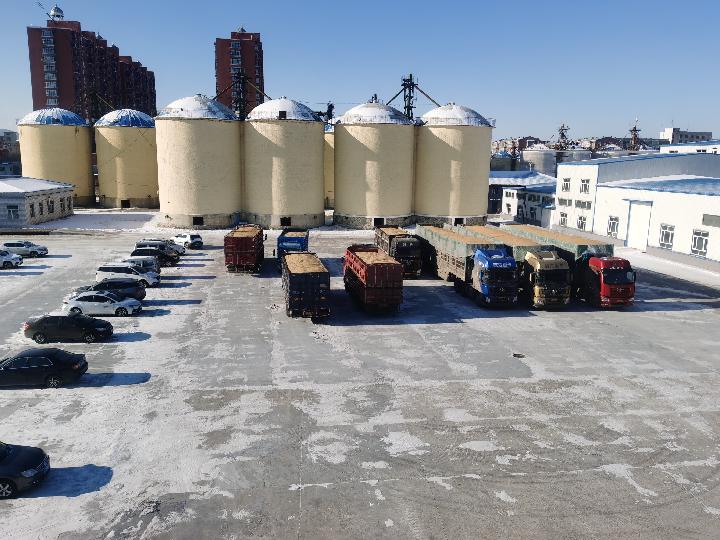 黑龍江立呈大豆蛋白有限公司廠區(qū)內(nèi),送糧的車(chē)輛等待卸車(chē)。新華社記者孫曉宇 攝