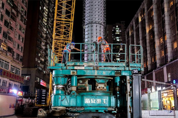 在鋼管立柱施工時(shí),遇見一條10千伏電力管線,空隙僅僅只有10厘米;還有一道污水管距離50厘米。為保護(hù)好管線,施工時(shí)管理人員現(xiàn)場(chǎng)全程指揮協(xié)調(diào),防止異常情況出現(xiàn)以便能及時(shí)協(xié)調(diào)解決,使鉆孔設(shè)備在小心翼翼地轉(zhuǎn)動(dòng)中安全順利完成了鋼管立柱插入施工。2022年10月10日,隨著最后一根26米長(zhǎng)的鋼管立柱緩緩吊裝、精準(zhǔn)插入鉆孔中,中大八院站蓋挖鋼管立柱全部完成施工。至此,項(xiàng)目部高風(fēng)險(xiǎn)大型起重吊裝施工全部完成、高噪音設(shè)備全部退場(chǎng),中大八院站全面進(jìn)入深基坑開挖及主體施工階段。項(xiàng)目部經(jīng)受住了第二波考驗(yàn)。