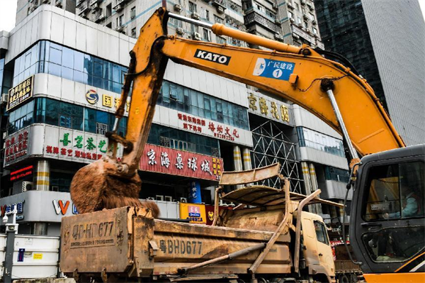 我們?cè)谧鳛楫?dāng)下施工主戰(zhàn)場(chǎng)的2號(hào)工點(diǎn)地面東邊施工現(xiàn)場(chǎng)看到,沒有明顯標(biāo)識(shí)卻能一眼分辨的“迷你”鋼筋加工場(chǎng)里,7、8名穿著“鋼筋工”馬甲的工人,或給鋼筋套絲,或彎制鋼筋構(gòu)件,或忙著調(diào)運(yùn)鋼筋捆……忙而不亂;在西邊,一臺(tái)抓斗機(jī)把土方從基坑里提出來(lái)放入旁邊的鐵鐵質(zhì)料斗箱里,一臺(tái)挖掘機(jī)又將箱里的土轉(zhuǎn)倒裝在運(yùn)土車?yán)?,土裝滿后鏟斗又將土壓實(shí)、將車幫上緣的土刮干凈,防止土在運(yùn)輸中掉落……