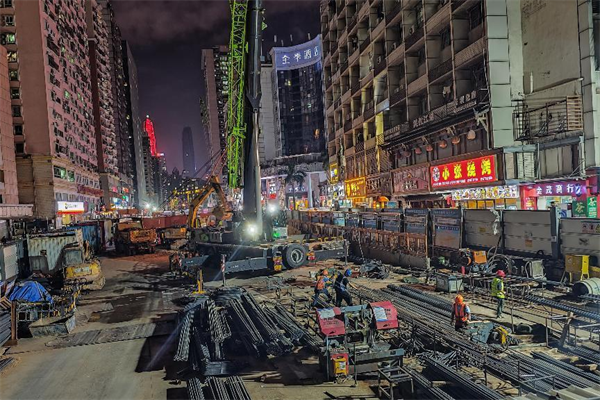 車站的交通疏解難點(diǎn)是方案的塵埃落定。在交通疏解的整體方案中分三期進(jìn)行,項(xiàng)目部先后與設(shè)計(jì)單位、市交管部門、區(qū)交管部門、市軌道辦、區(qū)軌道辦、地鐵公司及福田街道辦等協(xié)商解決。特別是第三期疏解方案是“福華路的福虹路口至華強(qiáng)南路段約210米的機(jī)動(dòng)車四車道全部封閉,兩側(cè)預(yù)留3至4米寬的人行道,封閉時(shí)間為20個(gè)月”,先后召開協(xié)調(diào)會(huì)20余次,不斷調(diào)整優(yōu)化并確定了方案,解決了“通往小區(qū)6處路口車和人流量非常大,以及深圳市最大的中醫(yī)院急救醫(yī)療通行和方便前來(lái)就醫(yī)車輛排隊(duì)等候”的難題。2021年3月6日,在交警的協(xié)助下,數(shù)分鐘內(nèi)迅速封閉兩端路口,近百名施工人員在統(tǒng)一指揮下同步進(jìn)行調(diào)整信號(hào)燈、布設(shè)相關(guān)交通標(biāo)志牌、擦改標(biāo)線、繪制長(zhǎng)160米導(dǎo)流線,安裝長(zhǎng)150米護(hù)欄、水馬、沙桶及交通引導(dǎo)等工作,圓滿完成第三期交通疏解施工。項(xiàng)目部實(shí)現(xiàn)施工場(chǎng)地全部圍蔽,中大八院站進(jìn)入了全面施工階段。