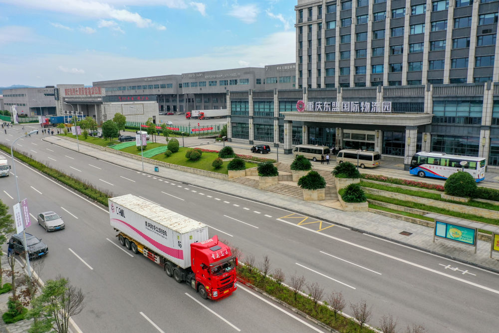 2023年10月11日,滿載筆記本電腦配件、發(fā)電機組件等產(chǎn)品的西部陸海新通道跨境公路班車從重慶南彭公路保稅物流中心駛出,將途經(jīng)廣西憑祥,直達越南(無人機照片)。新華社記者 黃偉 攝