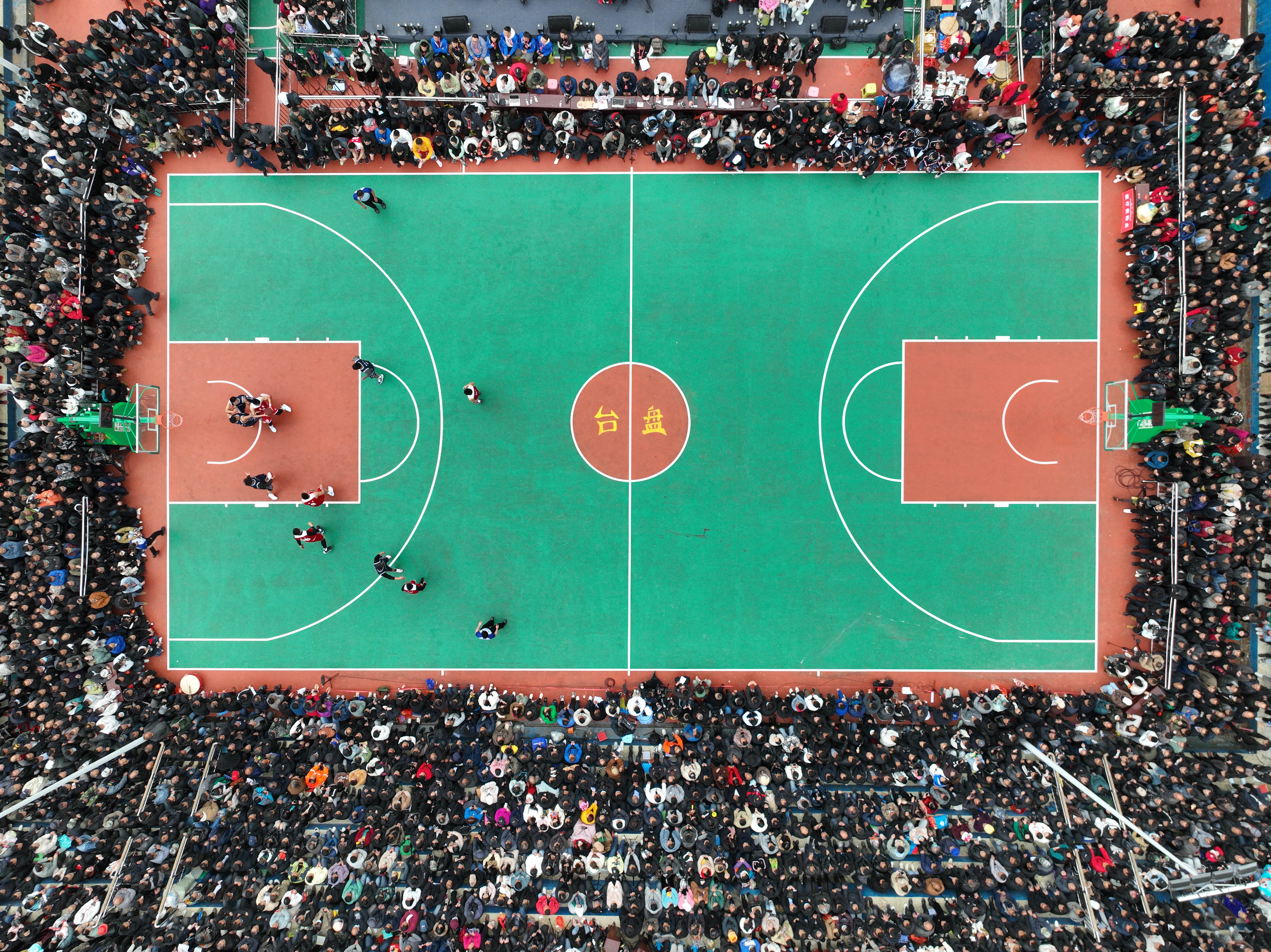這是2023年3月27日在貴州省黔東南州臺(tái)江縣臺(tái)盤村拍攝的貴州省首屆“美麗鄉(xiāng)村”籃球聯(lián)賽總決賽比賽現(xiàn)場(chǎng)(無人機(jī)照片)。新華社記者 歐東衢 攝