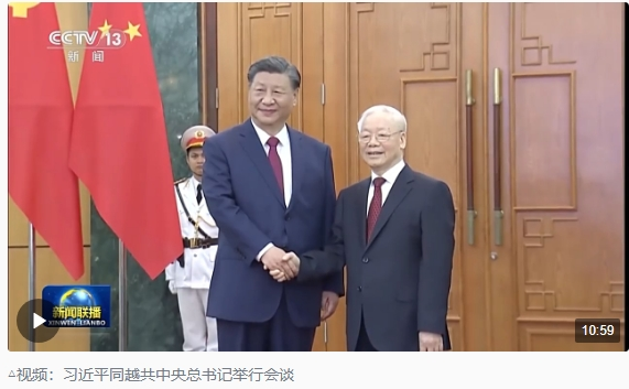 12月12日下午,越共中央駐地。越共中央總書記阮富仲在會談時說,“相信習近平總書記、國家主席這次訪問必將成為推動越中關系更上一層樓的歷史里程碑”。