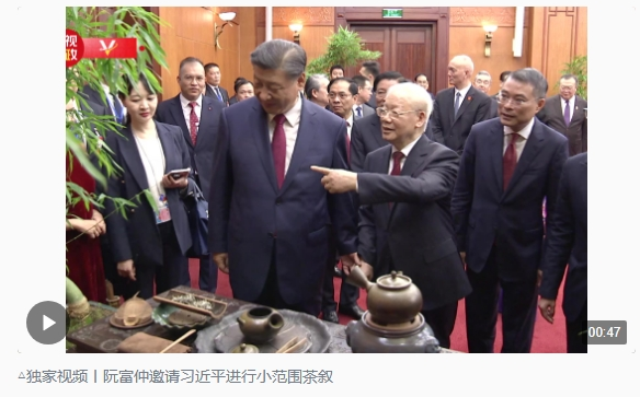 12月12日下午,習近平總書記同阮富仲總書記舉行會談。會談后,兩黨總書記共同見證雙方簽署的雙邊合作文件展示。阮富仲還邀請習近平進行小范圍茶敘。