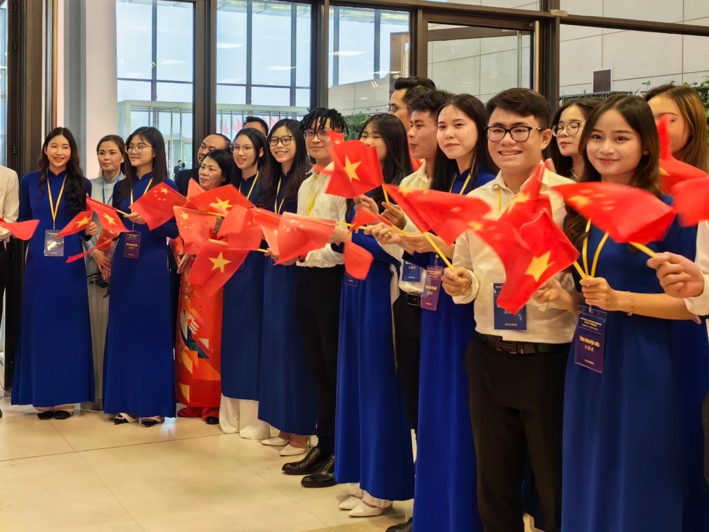 中越友好人士及青年見面會(huì)現(xiàn)場(chǎng)氣氛熱烈,鮮花和兩國(guó)黨旗國(guó)旗交相輝映,匯成一片喜悅的海洋。