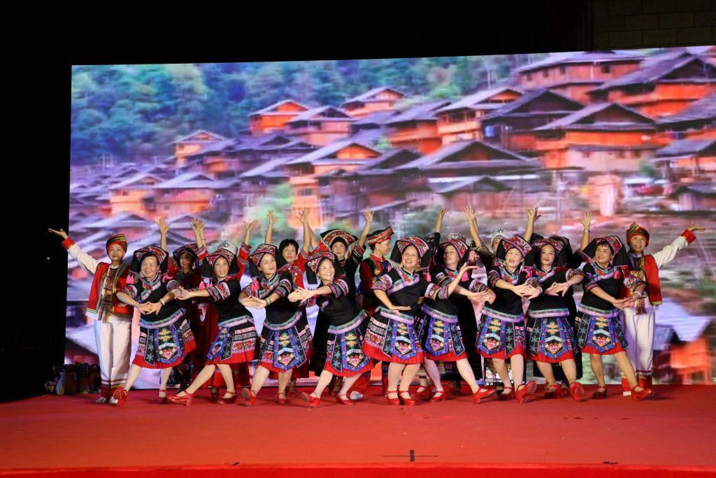 △2023年9月30日,廣西南寧市蟠龍社區(qū)舉辦的國(guó)慶節(jié)晚會(huì),居民們?cè)诒硌菝褡逦璧浮?/p>
