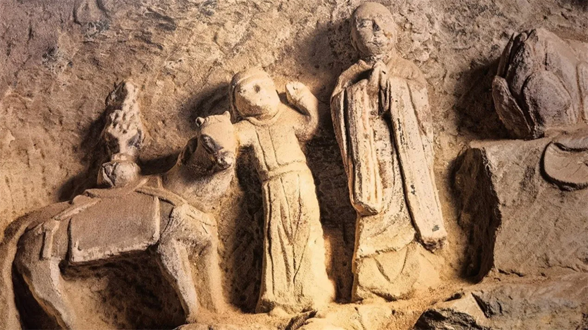 婦孺皆知的《西游記》是明代作家吳承恩根據(jù)唐朝僧人玄奘取經(jīng)的歷史創(chuàng)作的小說,小說里的唐僧即是玄奘。在鐘山石窟一號(hào)窟西壁有一幅石刻雕像正描繪了玄奘西行取經(jīng)的形象,要比《西游記》的創(chuàng)作還早500多年,成為目前已知年代最早的“玄奘取經(jīng)圖”。