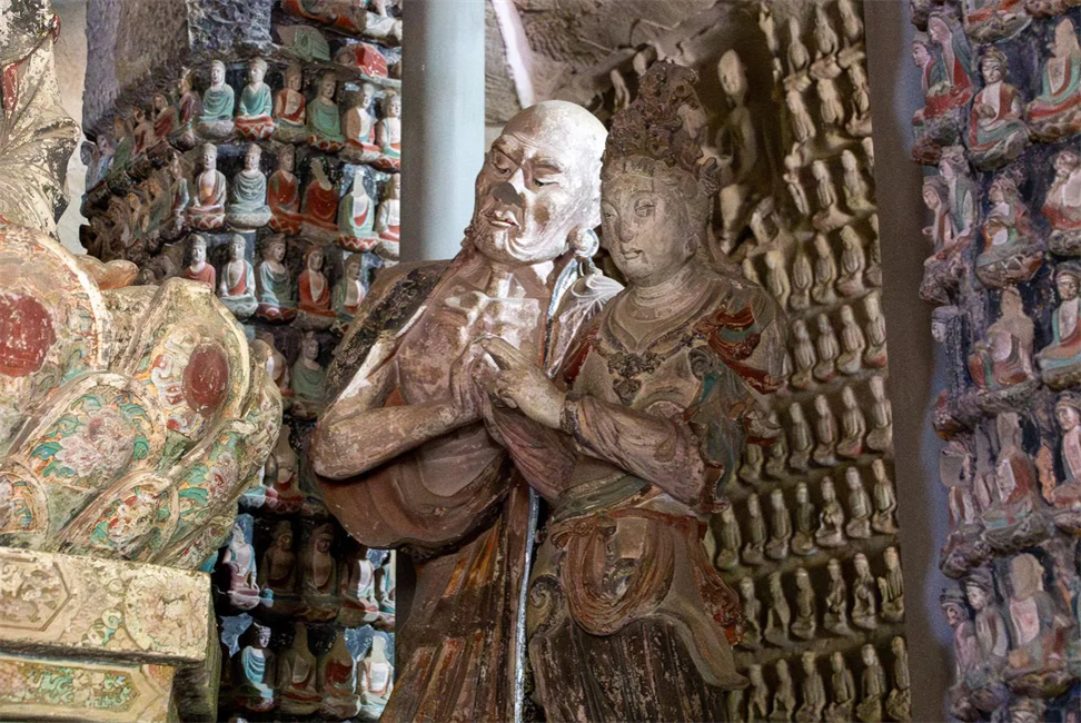 鐘山石窟一號(hào)窟雕像中,玄奘在前,圓形頭光,雙手合十,禮拜左側(cè)觀音,身后為一胡人形象,高鼻、深目、蓄發(fā),有發(fā)帶或瓜皮小帽一類的束發(fā)物,身著圓領(lǐng)窄袖袍服,右手牽馬,馬背駝物應(yīng)為經(jīng)卷。該組雕像只有玄奘、“猴行者”“白馬馱金”,沒有《西游記》中記載的豬八戒和沙和尚,不僅修正了“玄奘取經(jīng)圖”誕生于瓜州地區(qū)的觀點(diǎn),而且還印證了唐玄奘西天取經(jīng)的史實(shí),將《西游記》的故事向前推進(jìn)了500余年。