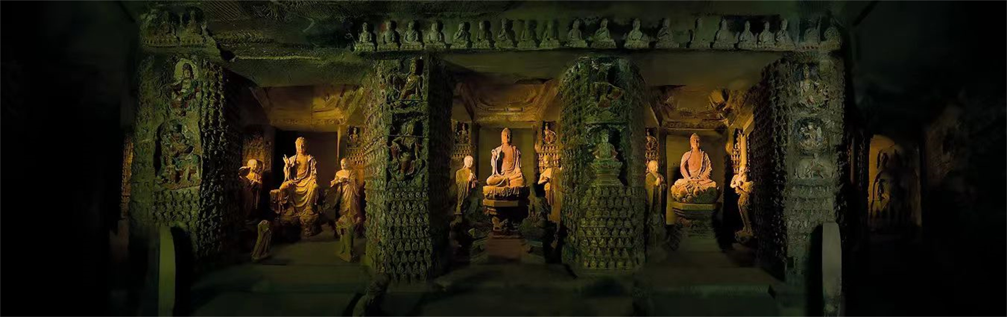 據(jù)史料記載,石窟原有十八窟,現(xiàn)僅發(fā)掘五窟。自東向西排列,其中以三號(hào)窟保存最為完整,被排為主窟。整個(gè)雕刻接地連天,一體合成,萬佛森立,莊嚴(yán)肅穆,色彩鮮艷,雕刻細(xì)膩、造型逼真、活靈活現(xiàn)、千姿百態(tài)、栩栩如生,浮雕佛像錯(cuò)落有致,因窟內(nèi)佛像萬余尊,所以也叫萬佛巖。