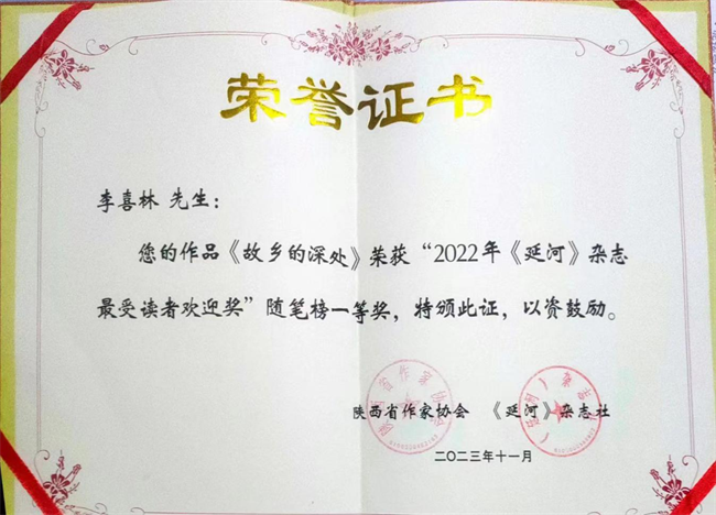 記者了解到,李喜林此次獲獎作品《故鄉(xiāng)的深處》曾刊發(fā)于2022年《延河》雜志11期,作品一問世,便廣受讀者關(guān)注。尤其是這篇隨筆里"大土場"那個部分,被制作出情景劇在田間和舞臺上傳播,觀眾被作品中濃厚的鄉(xiāng)音鄉(xiāng)情鄉(xiāng)愁深深打動。李喜林告訴記者,這篇萬把字的作品從創(chuàng)作到定稿,歷經(jīng)二年時間,他認(rèn)為對純文學(xué)作家來說,要有精品意識,心里要裝著讀者。