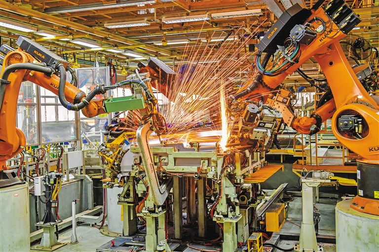 12月15日,在陜汽西安商用車產(chǎn)業(yè)園車身廠,工業(yè)機(jī)器人在焊接作業(yè)。