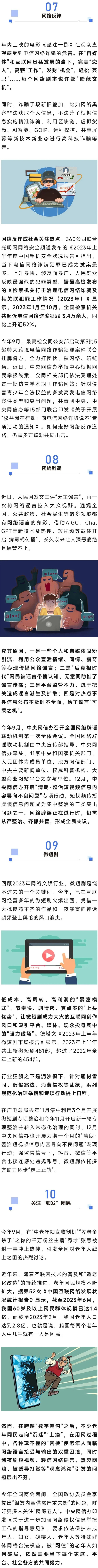 2023年,微短劇行業(yè)的“暴利”狂風席卷互聯網,政務新媒體集體“整活”破壁出圈,網絡公益“微力量”匯聚“大能量”溫暖人間,“老生常談”的反詐、辟謠、信息安全等話題呈現新看點,網絡戾氣、自媒體違規(guī)亂象等得到“重拳”整治,良好的網絡生態(tài)愈發(fā)清朗......