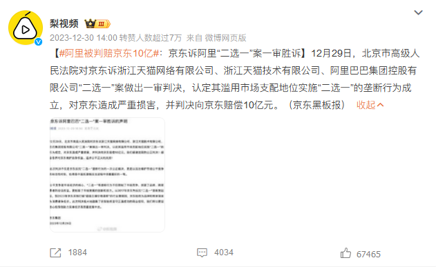 12月29日,京東訴阿里巴巴“二選一”案一審勝訴,阿里被判賠京東10億元。京東在聲明中稱,此次判決不僅是京東反抗“二選一”壟斷行為的一次公正裁決,更是以法治維護市場公平競爭秩序的標(biāo)志性時刻,也將是中國反壟斷法治進程中濃墨重彩的一筆。