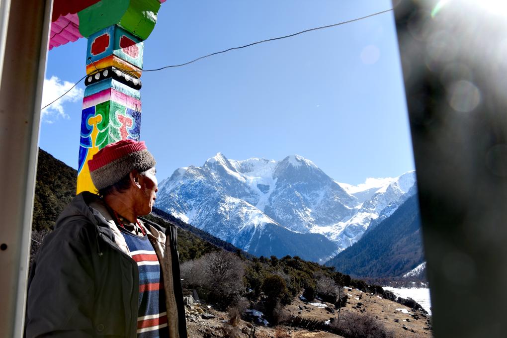 達(dá)瓦江村在自己的民宿二樓眺望梅里雪山群峰(1月5日攝)。新華社記者劉文博 攝