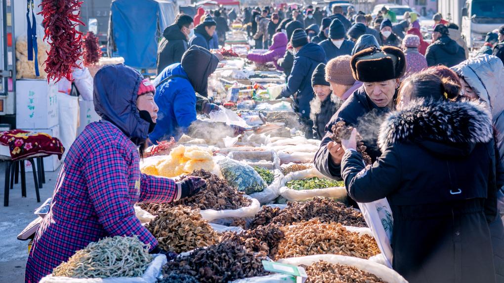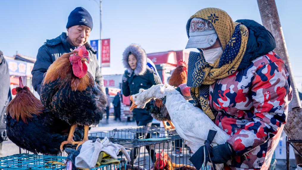 “凍梨凍柿子嘞,嘎嘎甜,不甜不要錢”“冰糖心蘋果賤賣嘍,3斤10塊”“排骨18塊1斤,棒骨8塊1斤”……臨近年關(guān),吉林省長春市近郊的卡倫大集上,人群摩肩接踵,叫賣聲此起彼伏。這個(gè)中國東北農(nóng)村集市年味漸濃。