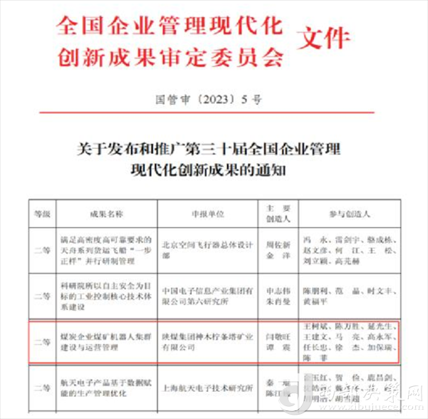 西部決策網(wǎng)訊 近期,全國企業(yè)管理現(xiàn)代化創(chuàng)新成果審定委員會印發(fā)《關(guān)于發(fā)布和推廣第三十屆全國企業(yè)管理現(xiàn)代化創(chuàng)新成果的通知》。檸條塔礦業(yè)公司管理創(chuàng)新成果《煤炭企業(yè)煤礦機(jī)器人集群建設(shè)與運(yùn)營管理》獲二等獎,是陜煤集團(tuán)所屬煤炭生產(chǎn)企業(yè)唯一一家獲獎單位。
