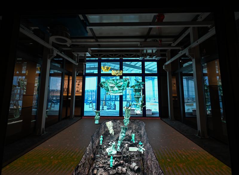 在三星堆博物館新館拍攝的裸眼3D技術還原的考古“方艙”。新華社記者王曦 攝