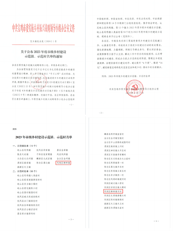西部決策網(wǎng)訊(記者劉玉 韓宗憲 通訊員 高莉娟)近日,寶雞市委辦、市政府辦關(guān)于印發(fā)《鄉(xiāng)村建設(shè)行動(dòng)方案》(寶辦發(fā)〔2022〕23號)和市委實(shí)施鄉(xiāng)村振興戰(zhàn)略領(lǐng)導(dǎo)小組辦公室關(guān)于印發(fā)《鄉(xiāng)村建設(shè)示范創(chuàng)建活動(dòng)實(shí)施方案》(寶鄉(xiāng)振組辦發(fā)〔2023〕9號)的通知精神,經(jīng)鎮(zhèn)村申報(bào)、縣區(qū)審核推薦,在縣區(qū)自查自評基礎(chǔ)上,寶雞市委實(shí)施鄉(xiāng)村振興戰(zhàn)略領(lǐng)導(dǎo)小組辦公室組織市委組織部等 14 個(gè)市級部門分組核查驗(yàn)收、集中綜合審定,鳳翔區(qū)柳林鎮(zhèn)和柳林鎮(zhèn)宋村被確定為2023年度市級鄉(xiāng)村建設(shè)示范鎮(zhèn)(村)。