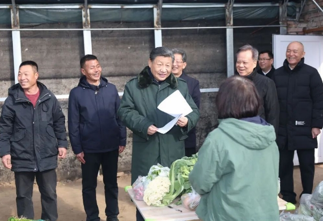 習(xí)近平握住一位農(nóng)民的手:“我們應(yīng)該感謝你們的辛勤勞動(dòng),豐富了春節(jié)的‘菜籃子’。”