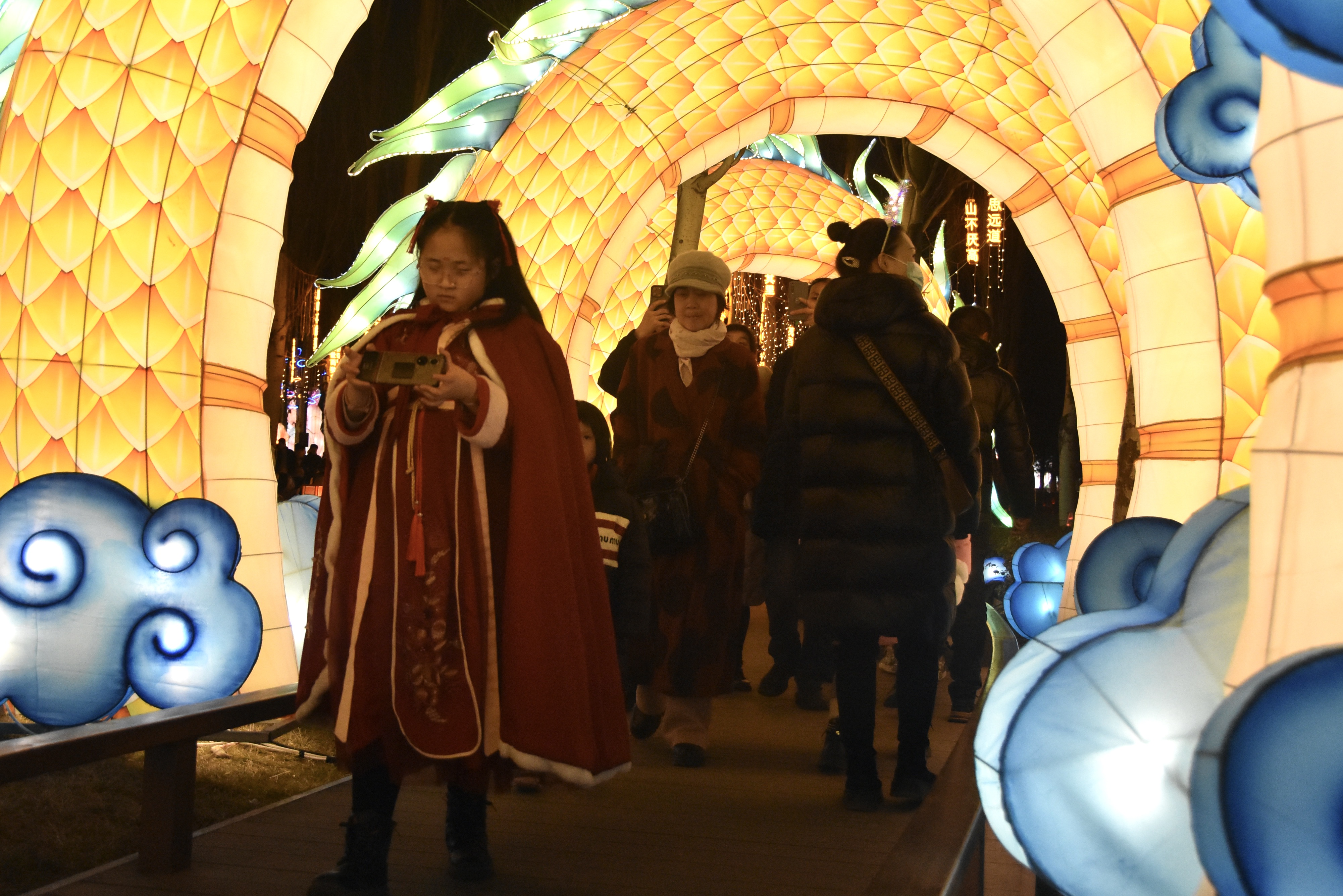 草坪上的鯤鵬花燈、漢韻宮燈,樹林里的熊貓花燈……不同主題的展區(qū)讓觀眾大飽眼福。“花燈節(jié)是公園新春嘉年華系列活動(dòng)的一大亮點(diǎn),突出了昆明池水資源優(yōu)勢(shì)與傳統(tǒng)中國(guó)龍?jiān)刂黝}的結(jié)合。”昆明池·七夕公園工作人員王妮表示,園方今年圍繞新春習(xí)俗與龍年元素,以賞花燈、逛市集、嘗美食、享民俗、潮游戲?yàn)橹骶€,打造具有濃濃煙火氣的多元消費(fèi)場(chǎng)景,帶給游客沉浸式的享受。