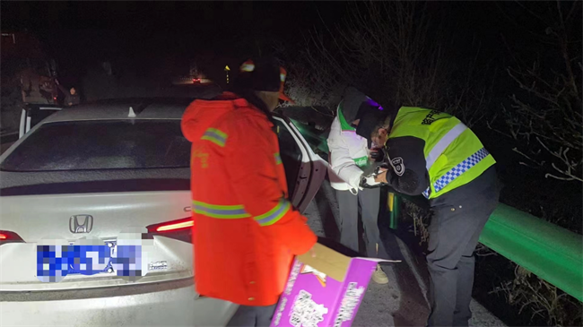 除雪保暢小分隊(duì)為過往受困車輛司機(jī)提供食物、熱水服務(wù)