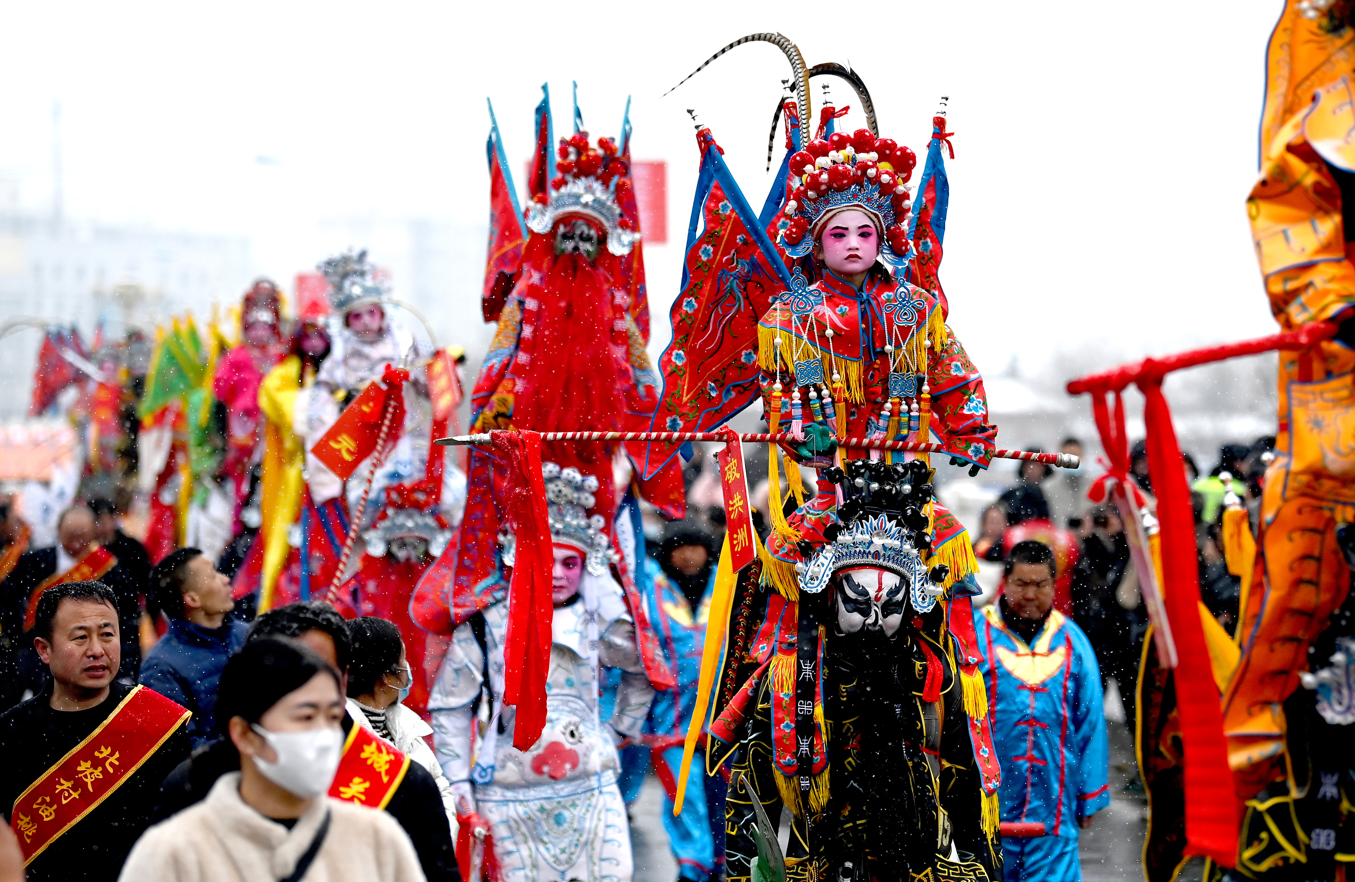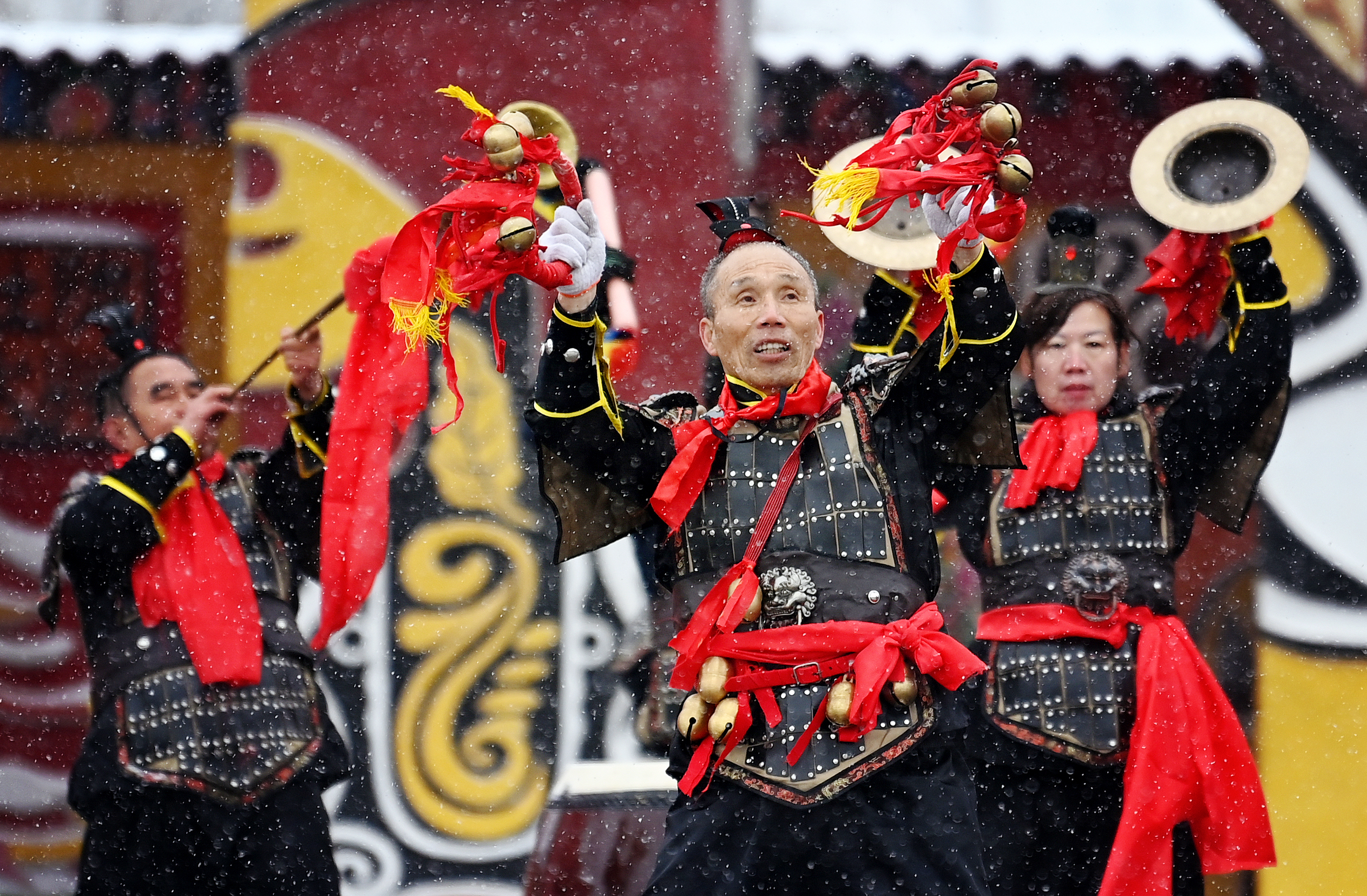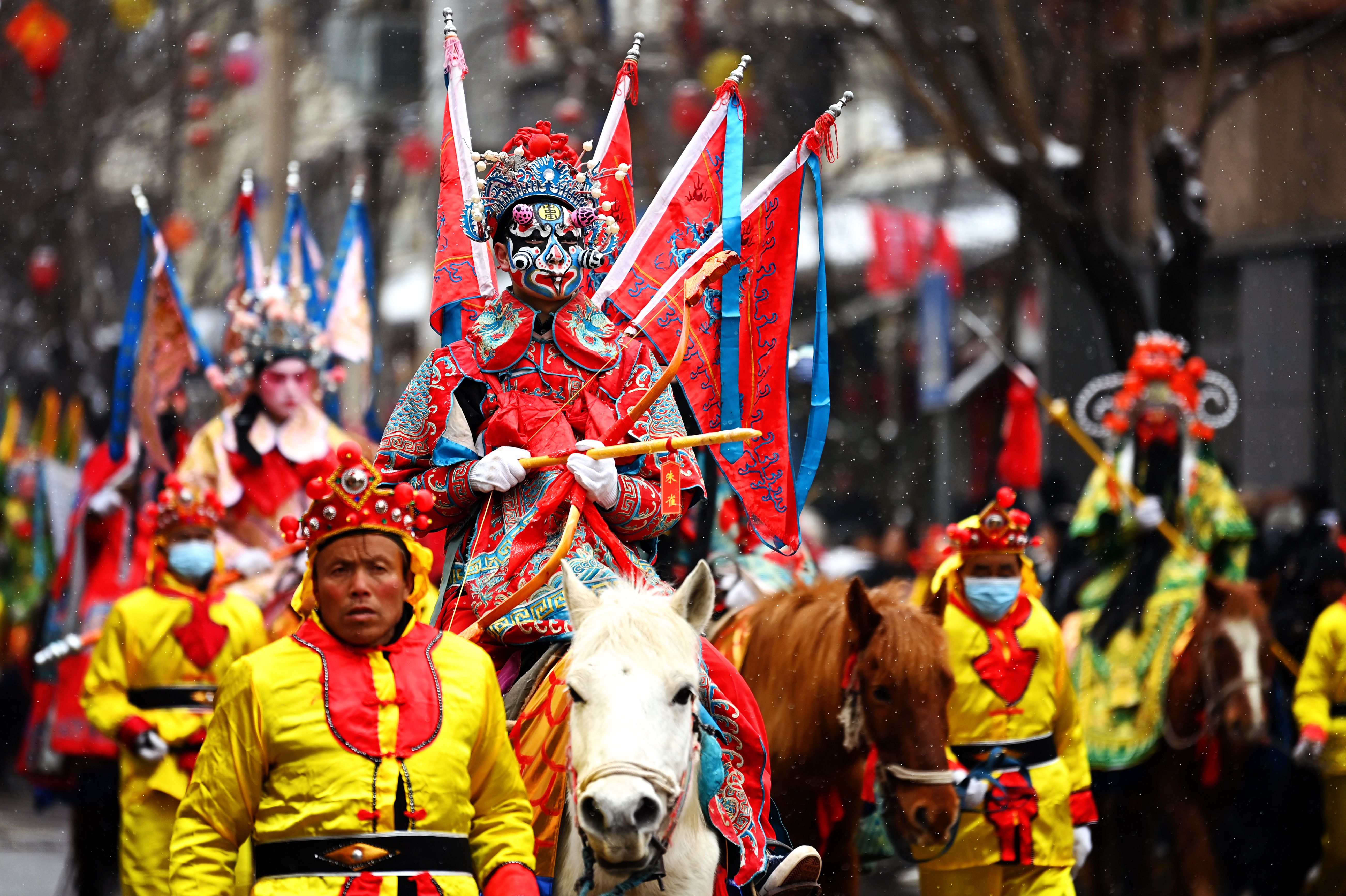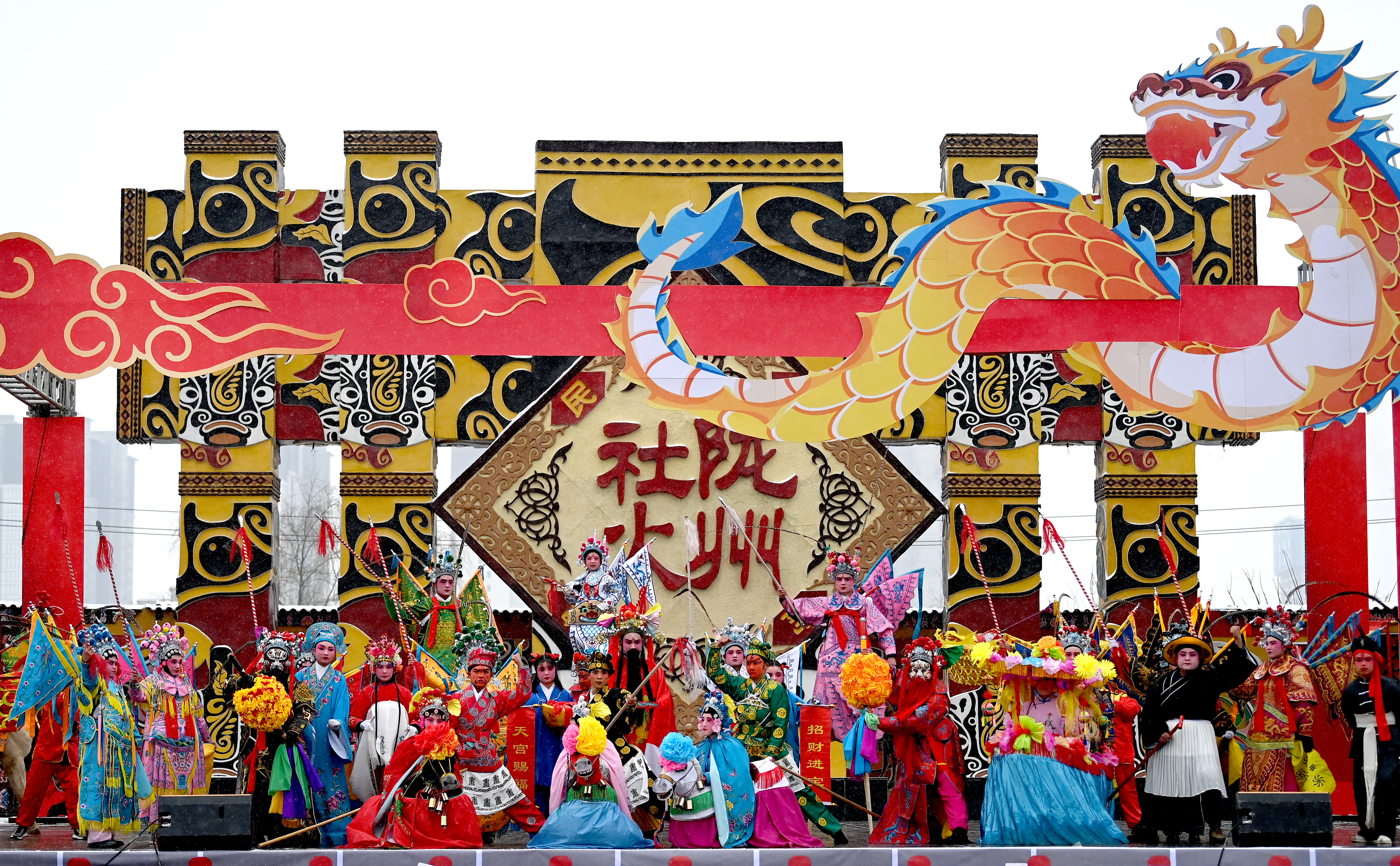 當(dāng)日是農(nóng)歷正月十三,來自陜西各地市的民間社火代表隊(duì)齊聚陜西隴縣,進(jìn)行社火展演及巡游活動(dòng)。在陜西,每年春節(jié)期間人們紛紛裝扮社火,走鄉(xiāng)串戶,進(jìn)行拜年迎春游演。