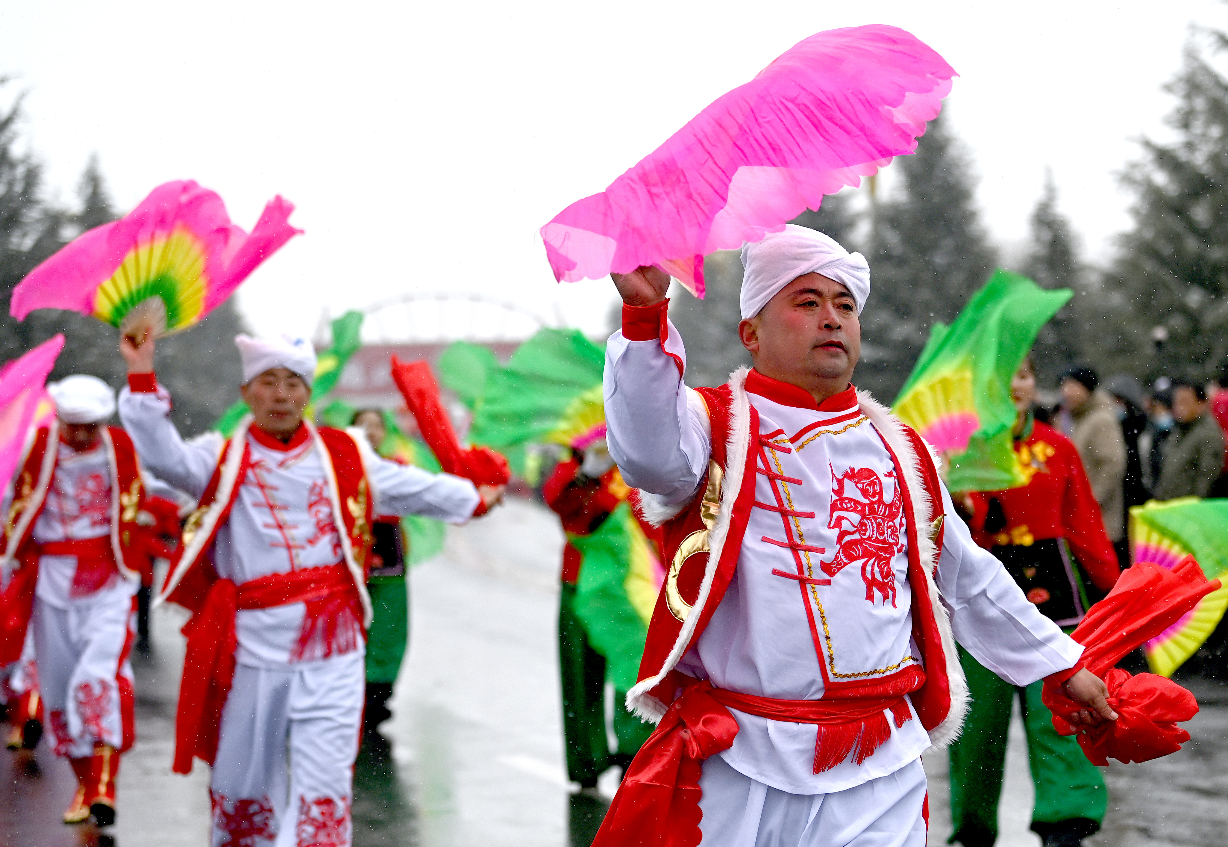 2月22日,在隴州社火過大年暨陜西省民間社火展演上,來自榆林市的社火隊(duì)在表演子洲秧歌。新華社記者劉瀟攝