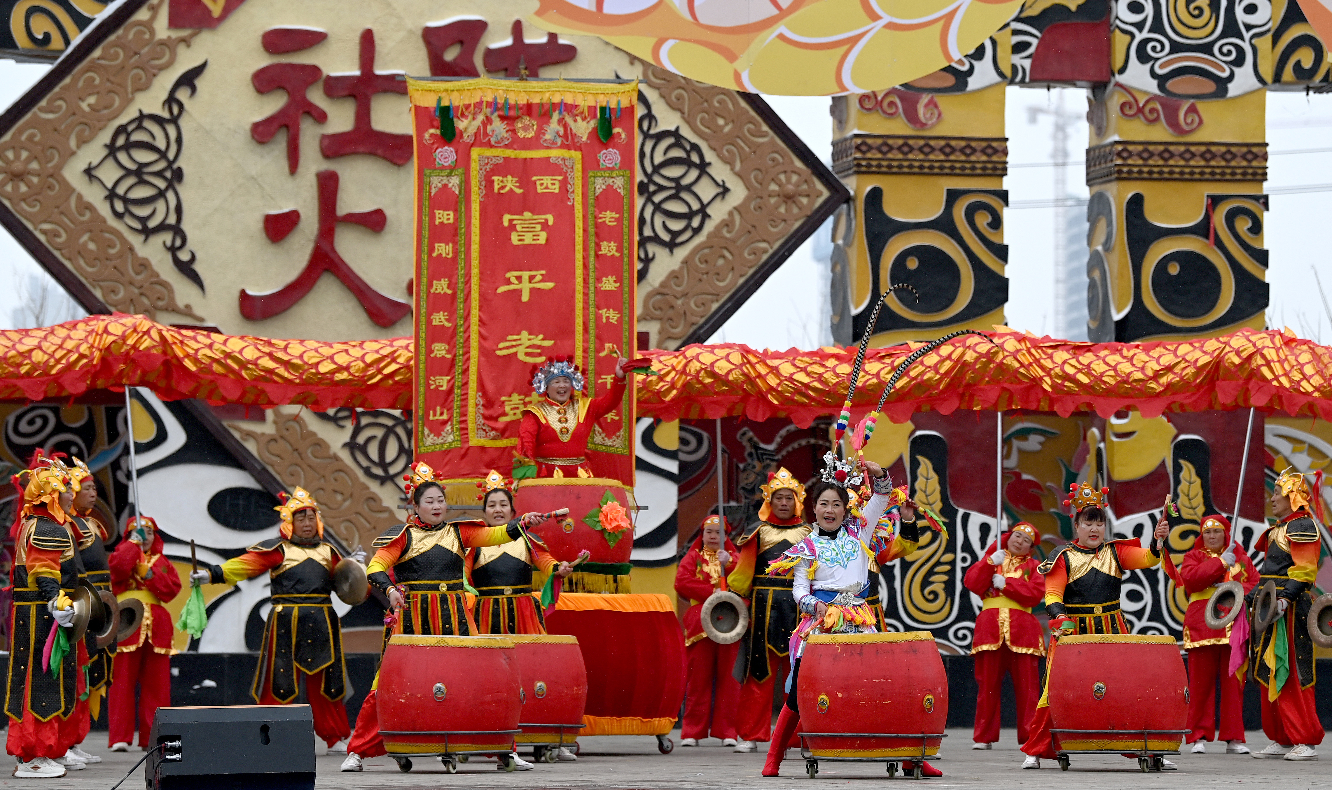 2月22日,在隴州社火過大年暨陜西省民間社火展演上,來自渭南市富平縣的社火隊(duì)在表演富平老鼓。新華社記者劉瀟攝