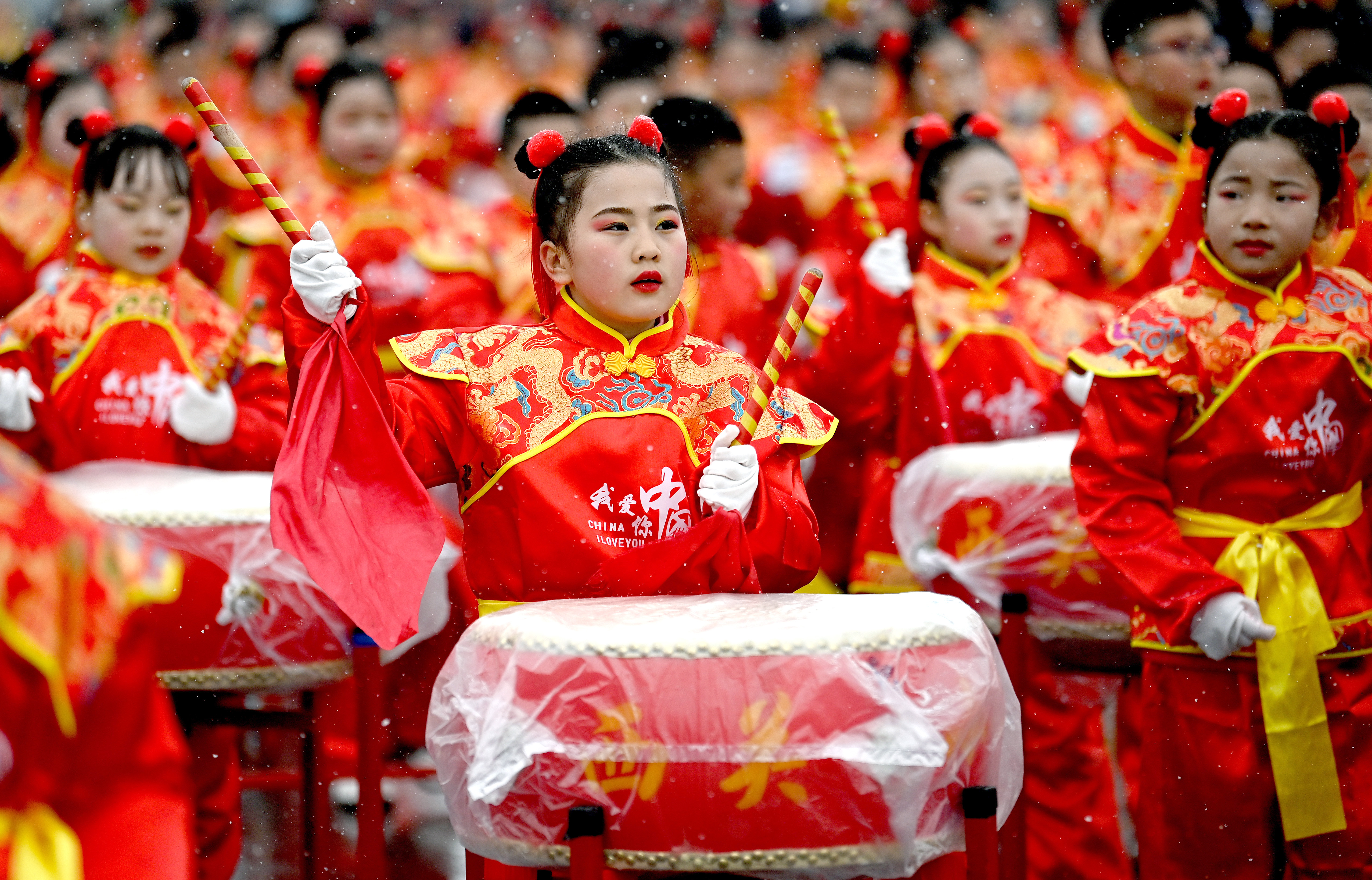 2月22日,在隴州社火過大年暨陜西省民間社火展演上,隴縣百人少兒鑼鼓隊(duì)在進(jìn)行巡游。新華社記者劉瀟攝