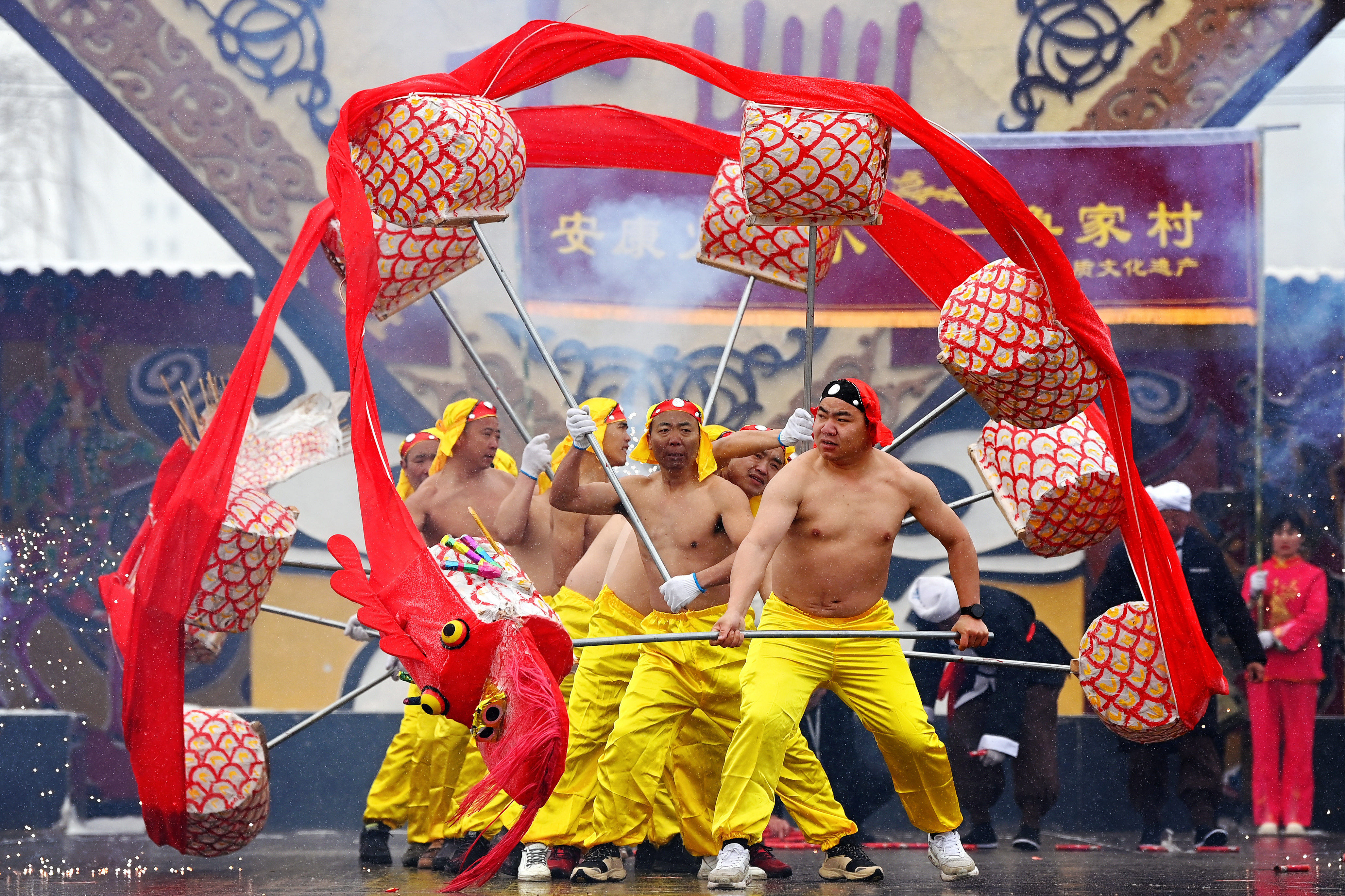 2月22日,在隴州社火過大年暨陜西省民間社火展演上,來自安康市漢濱區(qū)的社火隊(duì)在表演魯家村火龍。新華社記者劉瀟攝