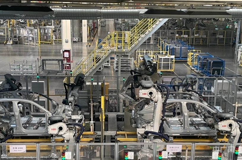 工業(yè)機器人正在完成焊接等工作(央廣網(wǎng)記者 劉昱 攝)